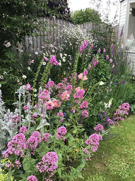 We have a lovely sunny garden with pond which backs on to fields and two patio areas for sitting and eating outside together with a summerhouse with electricity, heating and lighting.