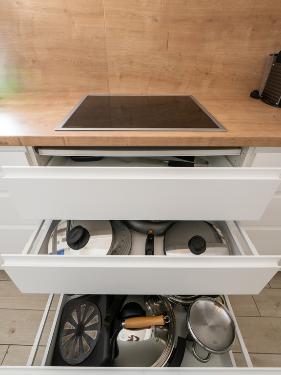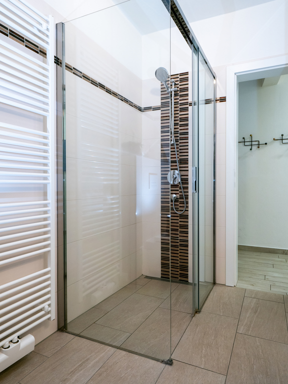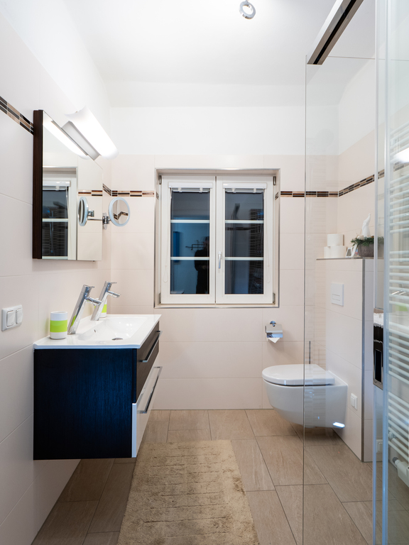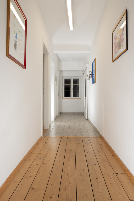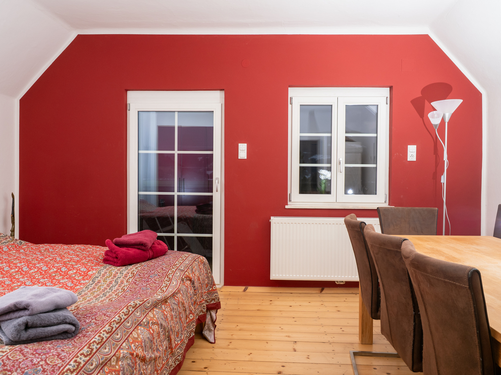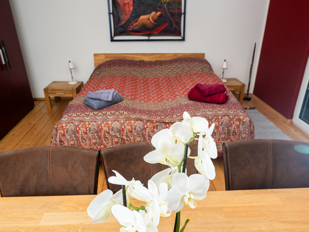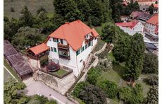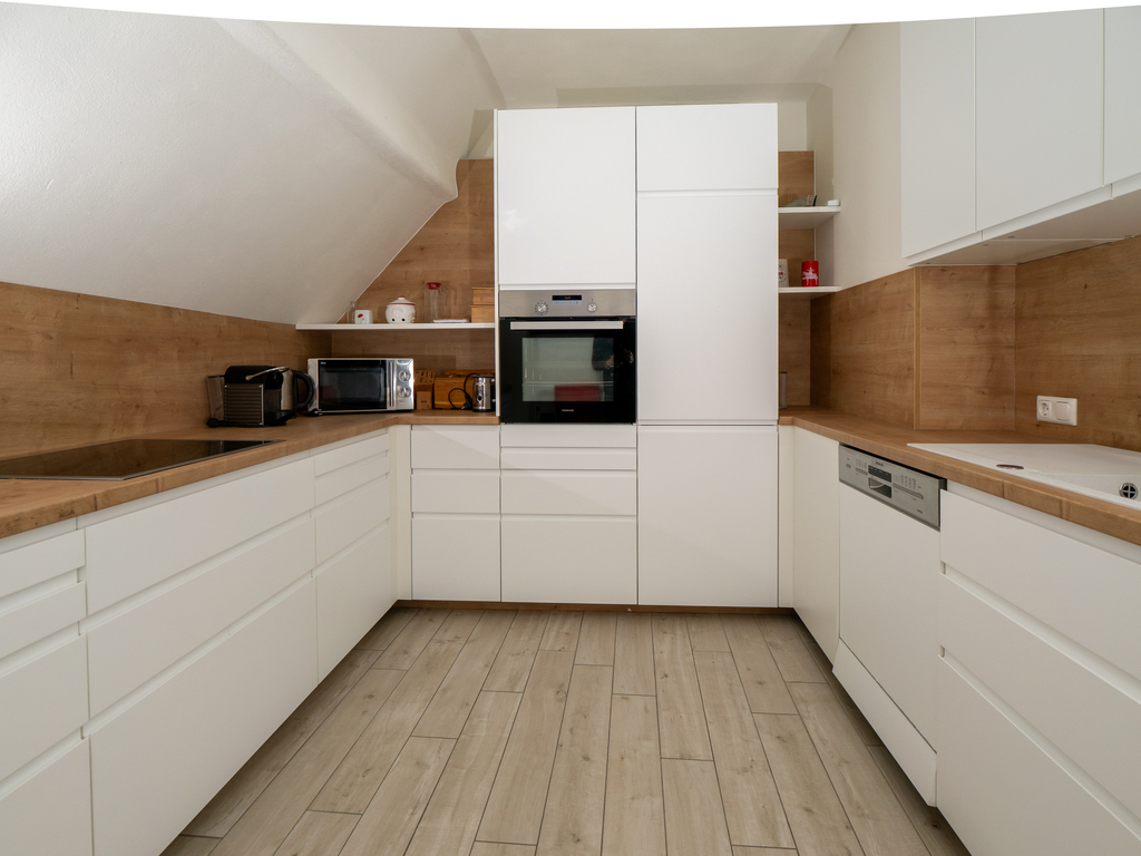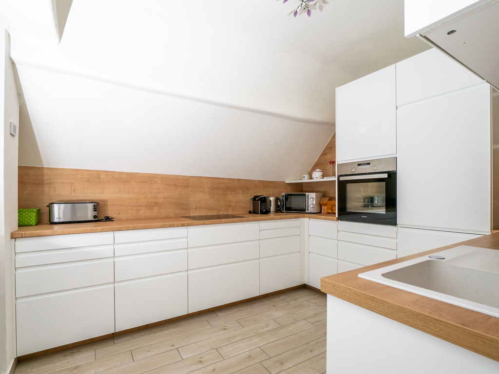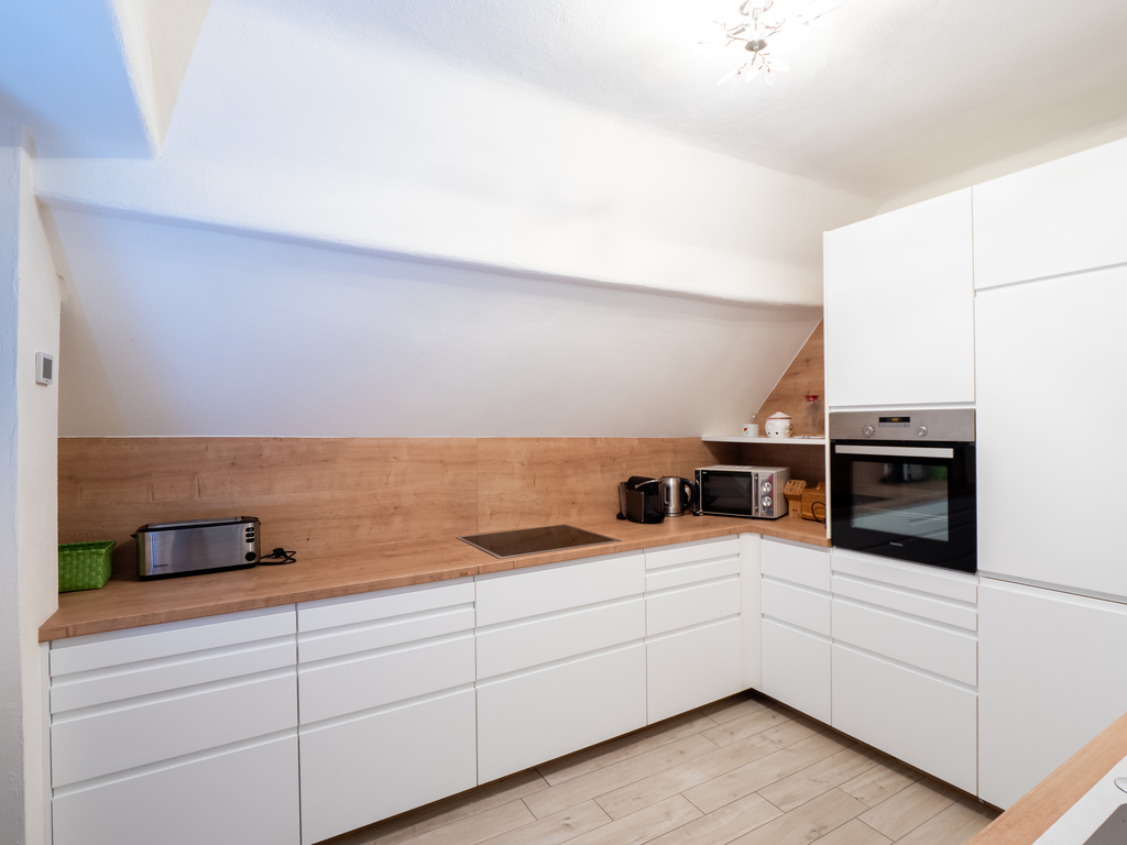 The holiday apartment includes two master bedrooms featuring king size beds (one with a sunny Eastward facing balcony with a stunning view and deckchairs, the other with a South-facing balcony as well as a sofa convertible into a king-size bed). The third - small - bedroom hosts a 1,40m wide double bed. The apartment is equipped with a bathroom featuring a shower and toilet as well as a double handwash basin. In addition, there is a separate toilet, an outdoor sauna with a panoramic view with a terrace and deck-chairs as well as cold water. The kitchen is fully equipped. A roofed patio with a large table comfortably seating 8 people invites you to spend your pasttime in the warmer months. A gas-fired BBQ is situated next to it. The old apple tree is perfect for using the double hammock in summer. In addition to the garage, a large parking lot offers additional space for cars. In front of the house, the huge trampoline invites you to use it. There is also a basic swing under the apple tree. As the house enjoys a privileged location directly below the castle of Obermurau, it is only accessible by stairs from the parking lot.