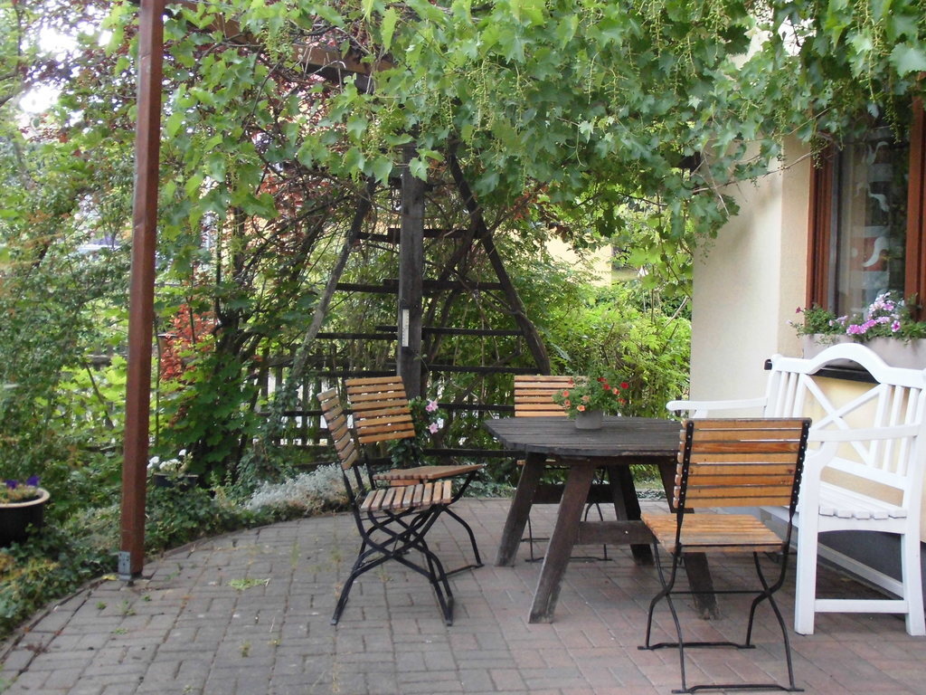 Relaxing under the apple trees or at the terrace Relaxing under the apple trees or at the terrace Morning impression of Bad Berkas Paulinenturm View over the nearby village of Tiefengruben Bad Berka City Center Weimar National Theatre with Goethe and Schiller Monument Erfurt Dome and Church of St Severi Wartburg Castle at Eisenach where Martin Luther lived as Junker Jörg and translated the Bible into German Krämerbrücke Erfurt the only medieval bridge with houses on north of the Alps Oberweissbach vertical train Dining and living room with  stove