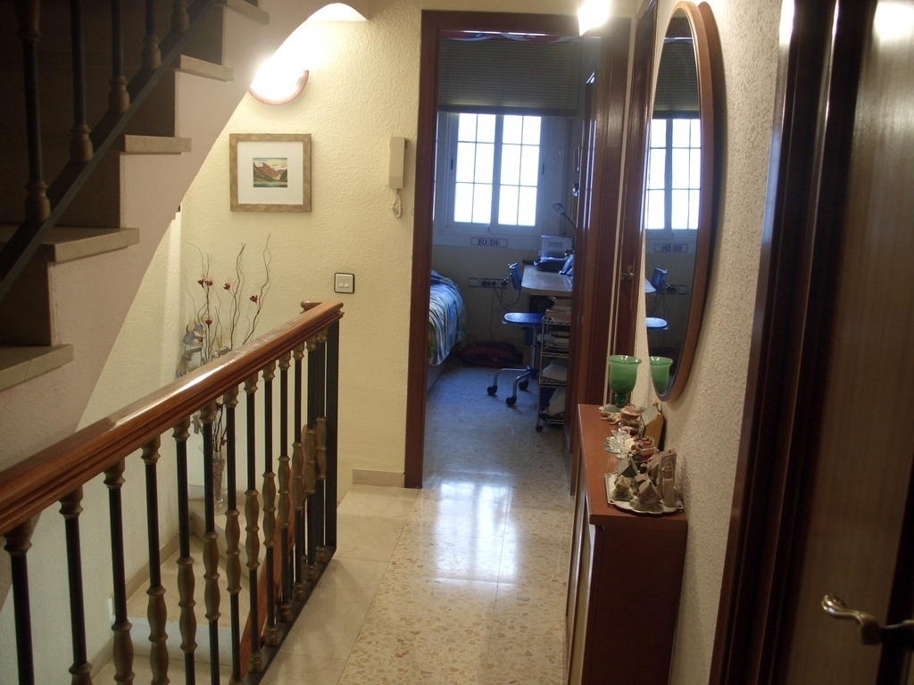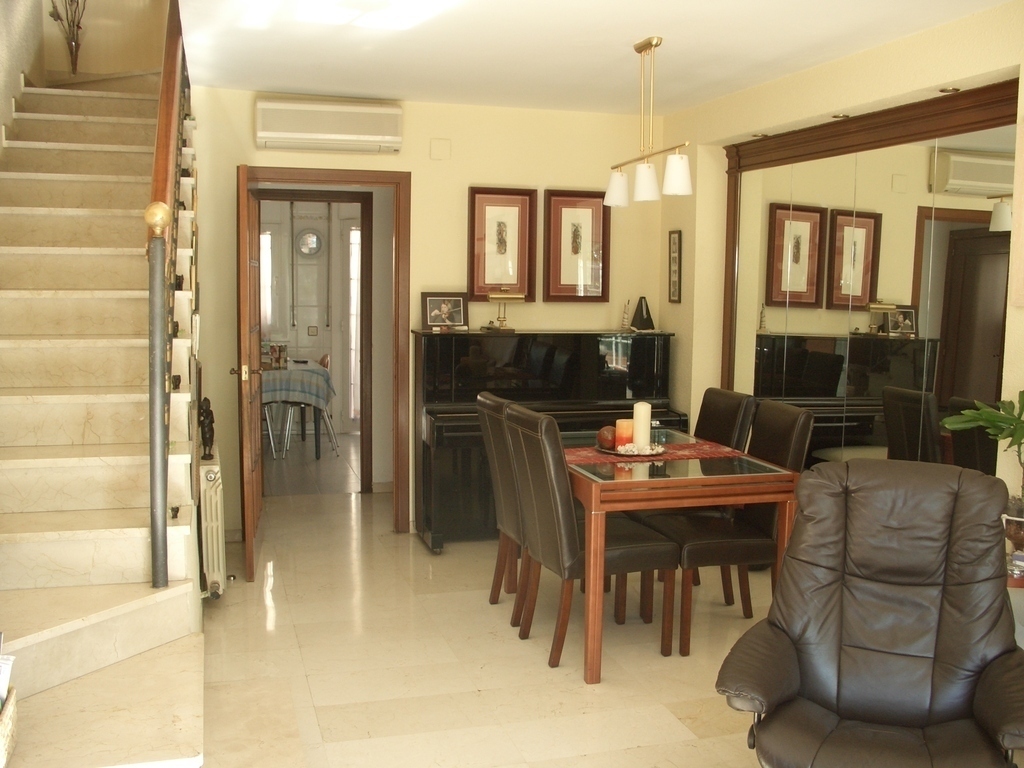 Terraced house located 800 metres from Barcelona, three minutes from the Mеtrо, 20 minutes on foot from FC Barcelona’s stadium, 30 minutes from the airport, and 20 minutes from Plaça de Catalunya, the Cathedral, the Gothic Quarter, etc. The terraced house can accommodate 5–6 people. The house has three floors: the upper floor has the study, with a bed; the second floor has 3 bedrooms and the main bathroom with balcony; the first floor includes a bedroom, the living room, the kitchen, a full bathroom, a patio and a balcony.
