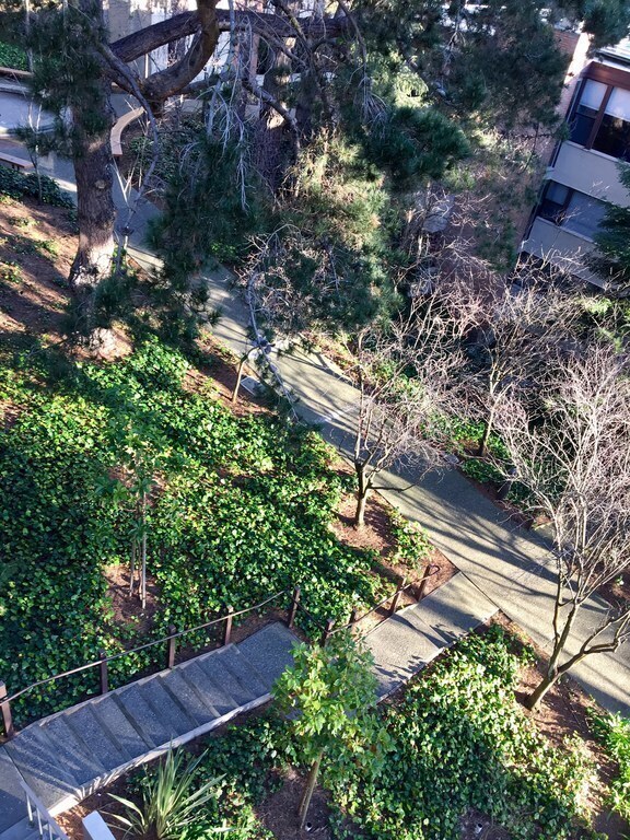 The home has high windows wrapping two sides—half of the entire apartment has huge walls of glass. Yet there is total privacy and quiet. Beautiful views across San Francisco to the West provide lovely sunsets nearly every evening. Or watch the fog roll in and across the neighborhoods, yet rarely reaching us at the top of Cathedral Hill (named for the famous Saint Mary's Cathedral, 1/2 block away). Our building has only 12 apartments, and is surrounded by a park-like setting with mature trees everywhere. It's one of the city's best-kept secrets.